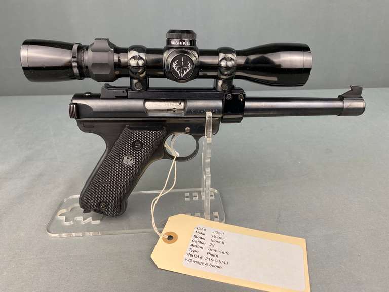 - This lot contains a Ruger Mark II Target 22LR Semi-Auto Pistol w/5 mags & Scope #215-04843.