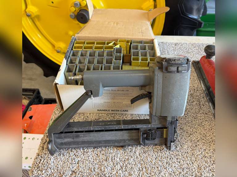 - This lot contains a Senco Air Staple Gun w/ Box of 1 1/4" x 1" Staples as pictured.