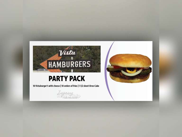 Lot Description: Feed the crowd with this delicious spread from Vista Drive In and Baskin Robbins! Enjoy 10 Vistaburgers with cheese, 10 orders of fries, and a decadent half-sheet Oreo cake to top it all off. Perfect for birthdays, celebrations, or just gathering friends and family for a fun night together.