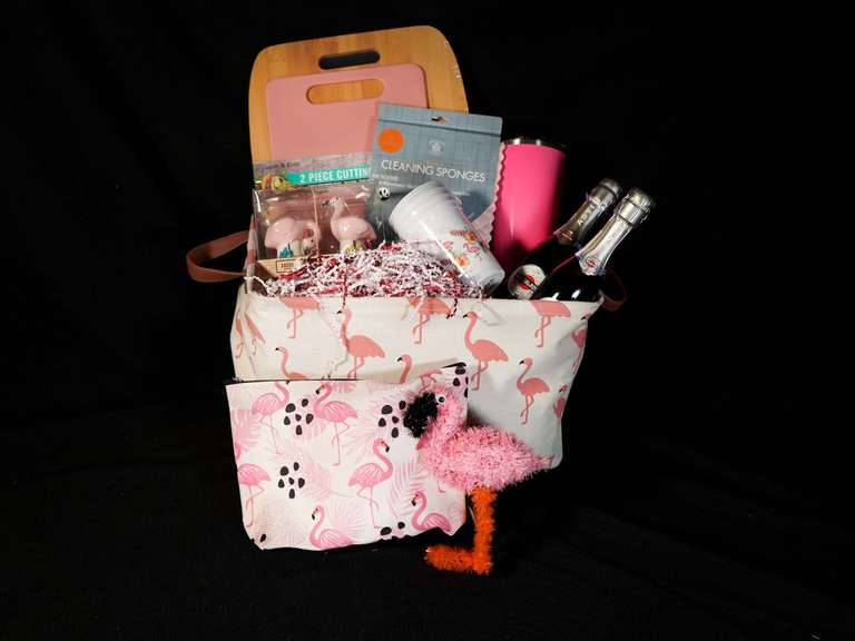 Lot Description: Add a splash of fun and flair to your day with this flamingo-inspired basket. From Darci Pottroff and Joleen Spain, enjoy a flamingo tote bag, makeup bag, decorative flamingo, flamingo salt & pepper shakers, a three-pack of pink microfiber cleaning sponges, a two-piece cutting board set, four flamingo-print cups, and a pink BrüMate. To toast the occasion, sip on two mini bottles of Martini & Rossi champagne from Jill Schneider, Realtor. A whimsical yet practical package that’s as festive as it is functional!