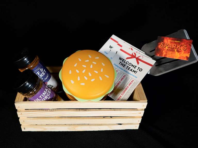Lot Description: Sink your teeth into this mouthwatering basket! Enjoy a $50 gift card from Sparks Burgers, plus three sets of four combo meals from Wendy’s. To top it off, a wood crate packed with Pit Boss seasonings, a burger spatula, and a silicone burger container from Jill Schneider, Realtor. Whether you’re grilling at home or grabbing your favorite fast food, this package is a burger lover’s dream!