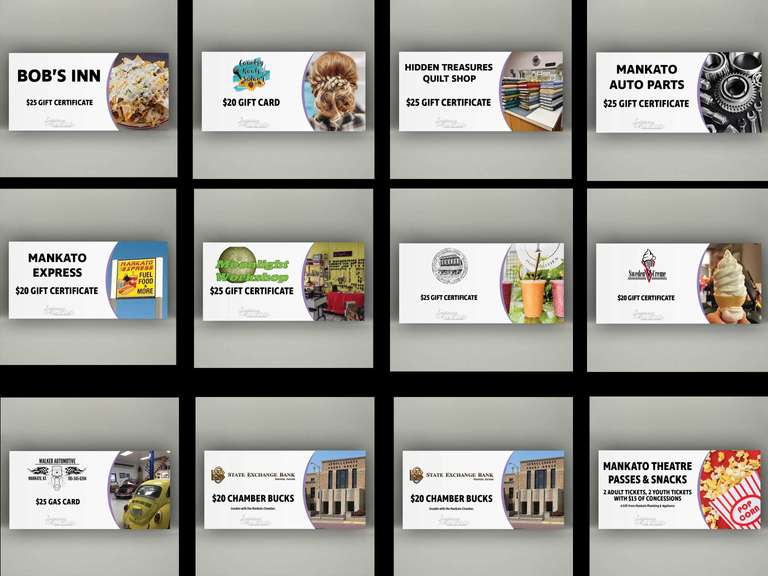 Lot Description: Explore the best of Mankato with this generous package of local dining, shopping, and entertainment. $25 gift certificate to Bob's Inn, $20 gift certificate to Country Roots Salon, $25 gift certificate to Hidden Treasures Quilt Shop, $25 gift certificate to Mankato Auto Parts, $20 gift certificate to Mankato Express, Movie night for four with tickets & concessions from Mankato Plumbing & Appliance ($33 value), $25 gift certificate to Moonlight Workshop, $25 gift certificate to Possibilities, $20 gift certificate to Sweden Cream, $25 gas card from Walker Auto Service, and $40 in chamber bucks from State Exchange Bank