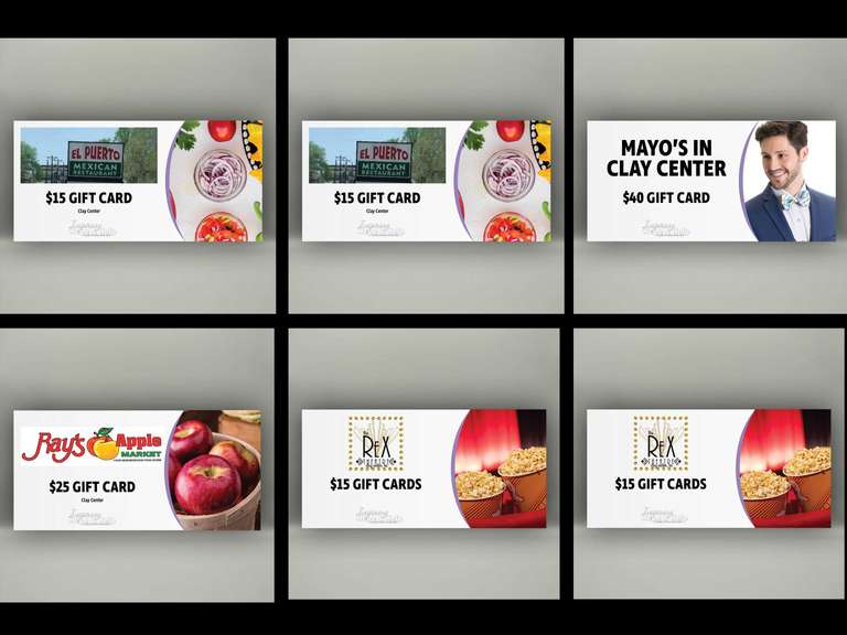 Lot Description: Enjoy dinner, groceries, and entertainment in Clay Center with a $30 gift card to El Puerto, $40 gift card to Mayo's. $25 gift card to Ray's Apple Market, and two $15 gift cards to The Rex Theatre.