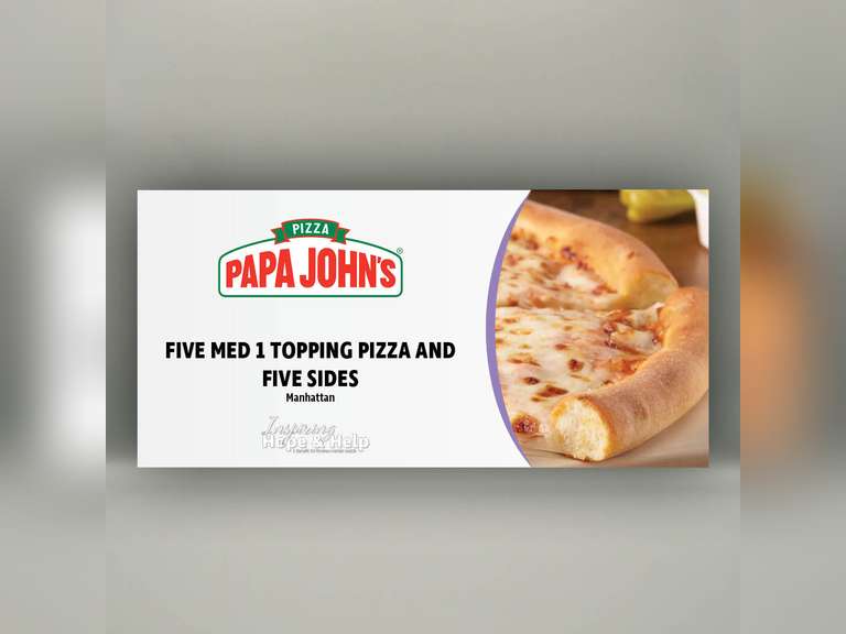 Lot Description: Enjoy variety with five medium one-topping pizzas and five sides from Papa John’s, plus a full set of 12 medium two-topping pizzas from Domino’s West.