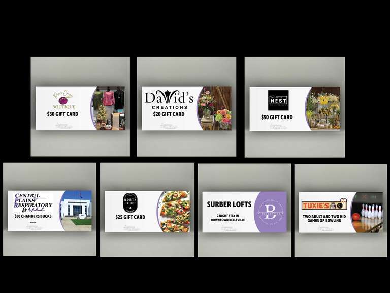 Lot Description: Discover the charm of Belleville with this generous bundle form local businesses, $30 gift card from Plum Crazy Boutique, $20 gift card from David's Creations, $50 gift card from The Feathered Nest, $50 in Chamber Bucks from Central Plains Respiratory, $25 Gift Card from North Side Pizza & More, a 2-night stay at the Suber Loft and two adult and two kid games of bowling at Tuxies Ten Pin & Grill.